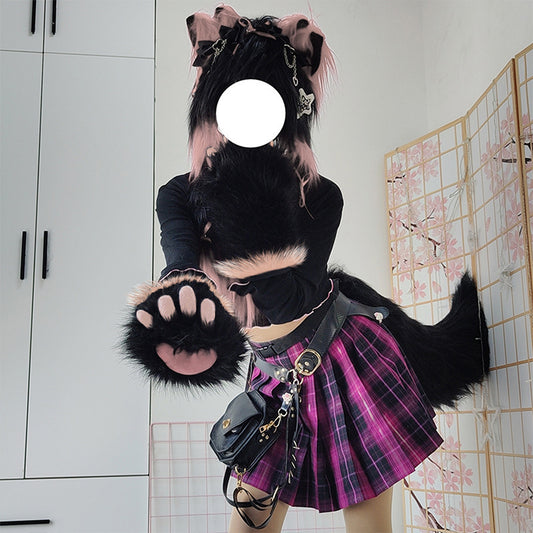 Plush Furry Paws Gloves - Black Pink