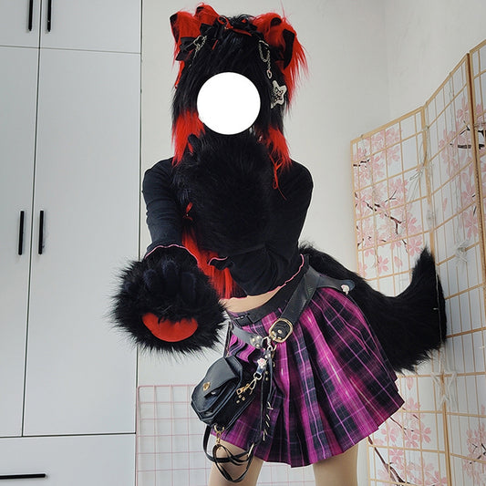 Plush Furry Paws Gloves - Black Red
