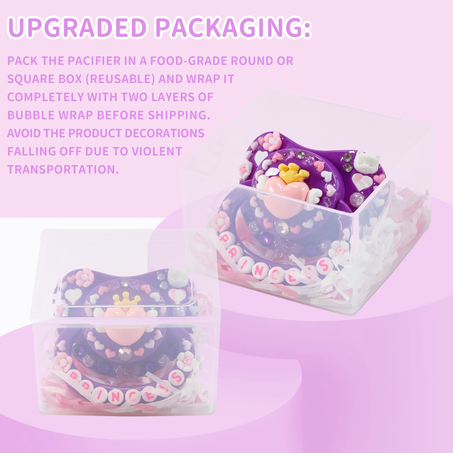 Upgraded Packaging: Pack the pacifier in a food-grade round or square box (reusable) and wrap it completely with two layers of bubble wrap before shipping.