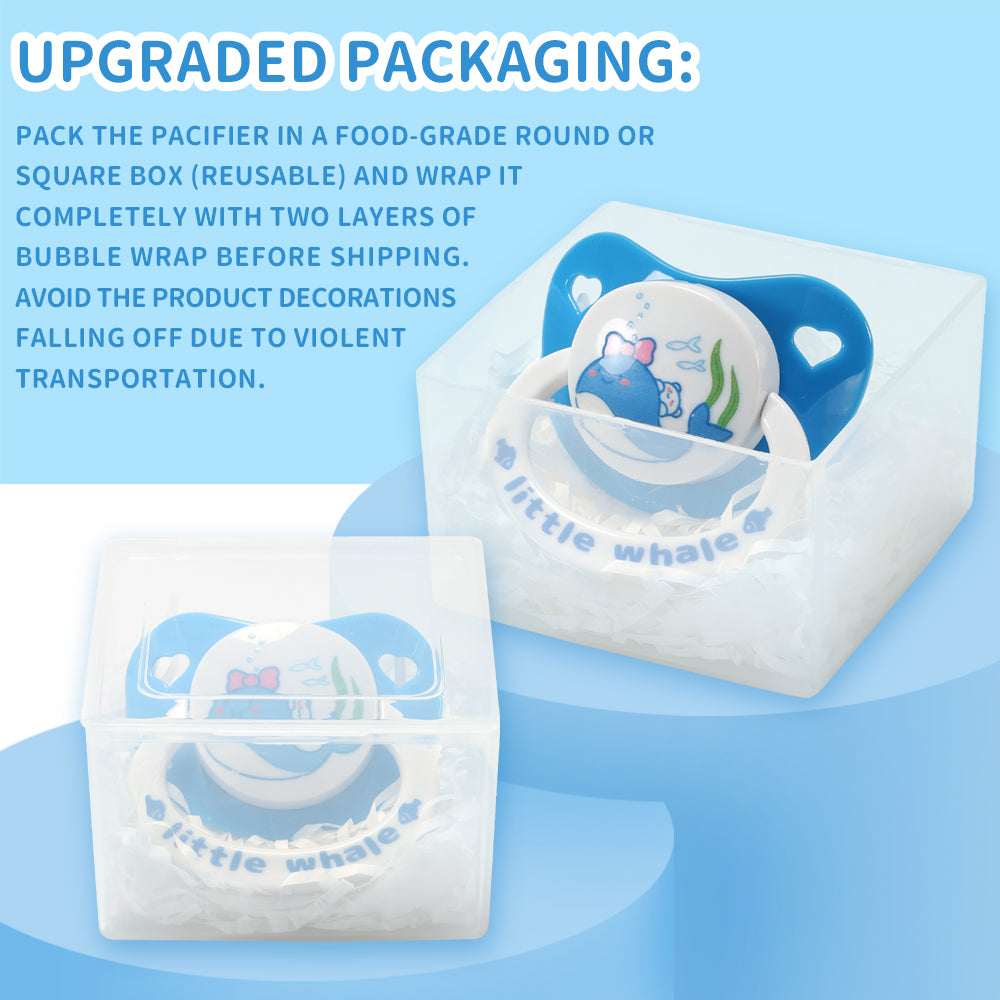 Upgraded Packaging: Pack the pacifier in a food-grade round or square box (reusable) and wrap it completely with two layers of bubble wrap before shipping.